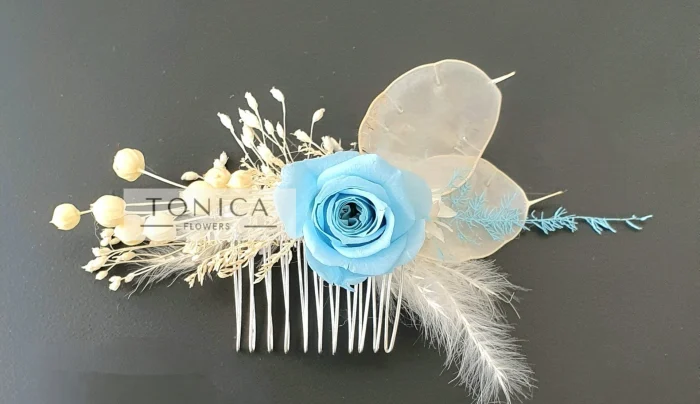 Pieptan par realizat cu trandafir criogenat mic(dimensiune ≃ 6 cm) si plante uscate. Se poate realiza pe culorile dorite de client. Pentru personalizare va rugam sa ne contactati.
