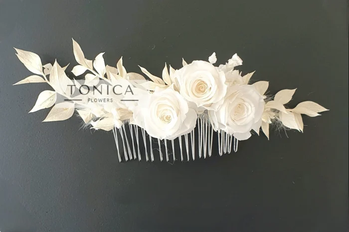 Pieptan par, 3 trandafir criogenat mici(dimensiune ≃ 6 cm) si plante uscate. Se poate realiza pe culorile dorite de client. Pentru personalizare va rugam sa ne contactati.