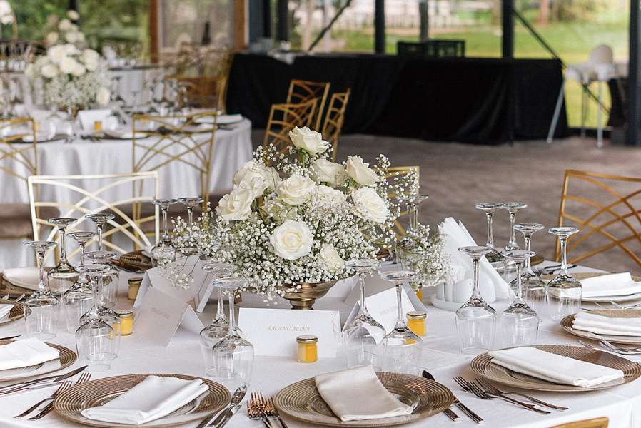 ARANJAMENT DE MASA CU TRANDAFIRI ALBI SI FLOAREA MIRESEI, CU VAS AURIU ELEGANT