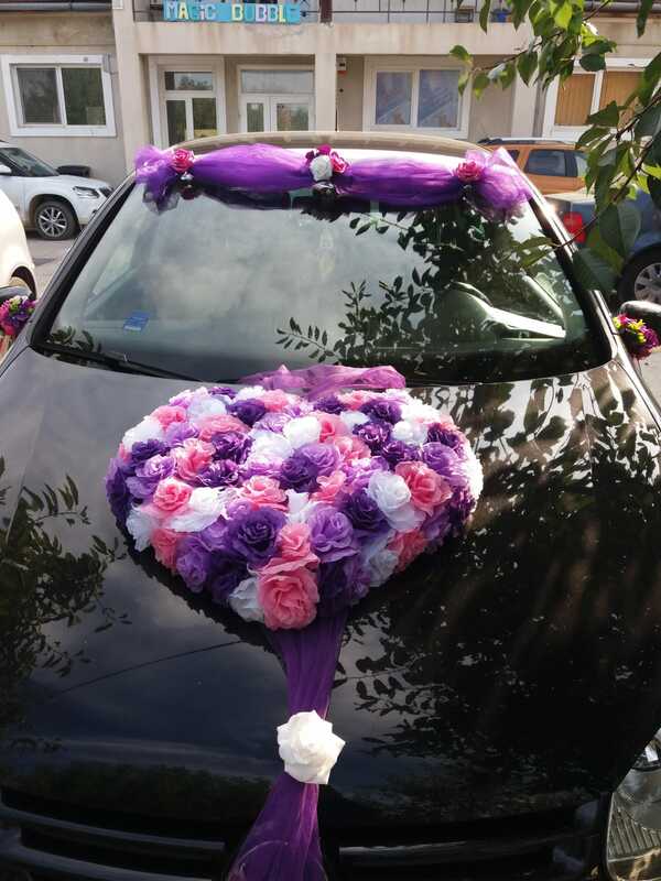 Aranjament floral cu ventuză; tull în ”V” de 7m lungime; culori diferse. Flori din mătase; Nu se decolorează în caz de vreme nefavorabilă.