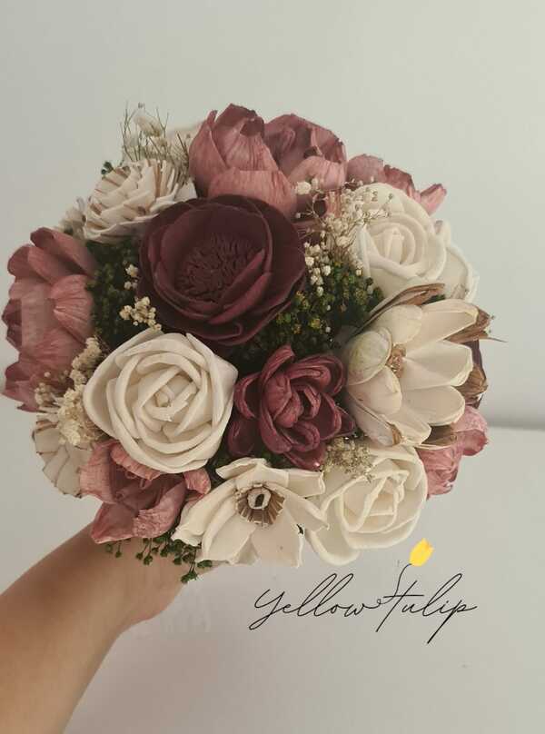 Produsele sunt realizate cu flori din fâșii de lemn de tapioca, care tratate cu o soluție pe bază de glicerină vegetală, capătă finețea și flexibilitatea petalelor naturale de flori iar în combinație cu verdeata naturala stabiliata, acestea nu doar ca vor căpăta un aspect extrem de natural, dar în plus, pot fi păstrate pentru totdeauna!
