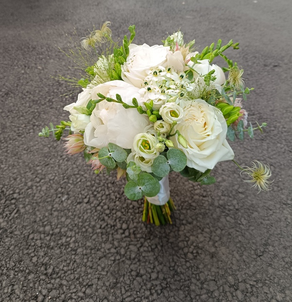Un buchet compus din 3 trandafiri albi, 3 eustoma alba, 3 bujori albi, 5 frezia alba, 2 clematis, 3 ornitogalum, 3 panicum, 3 serruria, eucalipt și saten asortat.
