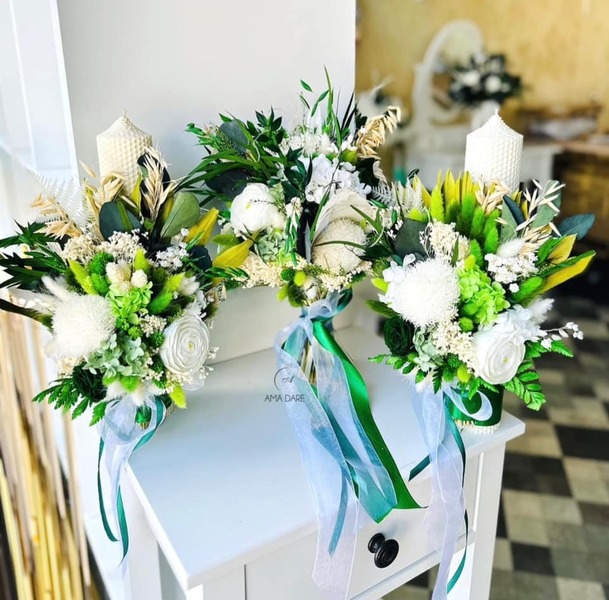 Decorate cu flori criogenate și uscate, cu panglică de cea mai bună calitate la alegere (satin, dantela, voal chiffon, matase etc) acestea susțin atmosfera din jurul lor și se potrivesc perfect pe lângă faptul că sunt eficiente la orice nuntă.