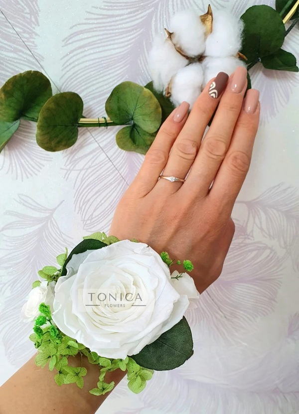 Bratara cu trandafir criogenat mare + 2 mici. Bratarile sunt lucrate cu flori naturale uscate si stabilizate. Pretul este pe bucata. Dimensiunea ≃ a trandafirului mare: ⌀6.5 cm si H5,5cm, iar dimensiunea ≃ a trandafirului mic ⌀2.5-3 cm si H2-2,5cm Bratara este realizata pe sistem prindere tip perle. Cromatica poate fi aleasa in functie de preferinte. Florile nu necesita ingrijire avand o durata lunga de viata. Bratarile sunt unicat, nu pot fi 2 identice 100%. Florile pot diferi in functie de disponibilitatea stocului. Majoritatea produselor de pe site-ul nostru sunt disponibile cu precomanda (in perioada nuntilor si in plin sezon al acestora, comanda se plaseaza cu minim 5 saptamani inainte)