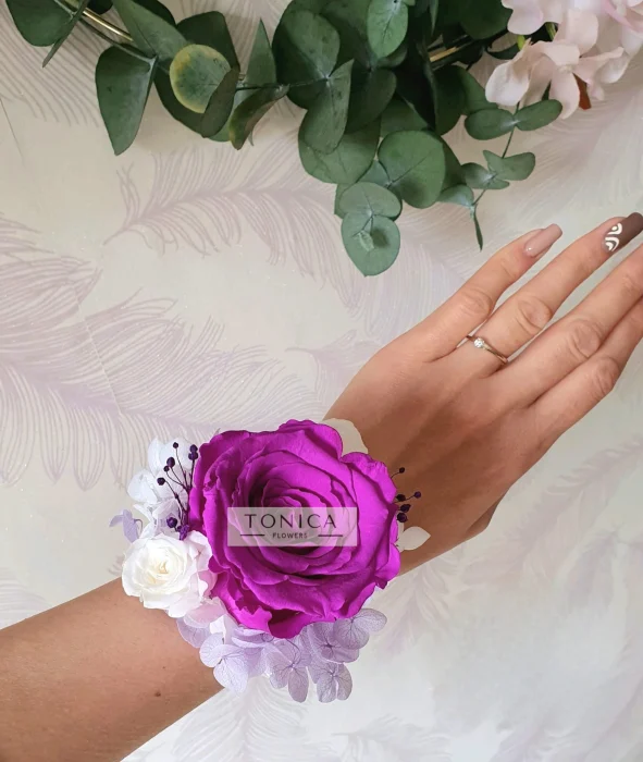 Bratara cu trandafir criogenat mare + 2 mici. Bratarile sunt lucrate cu flori naturale uscate si stabilizate. Pretul este pe bucata. Dimensiunea ≃ a trandafirului mare: ⌀6.5 cm si H5,5cm, iar dimensiunea ≃ a trandafirului mic ⌀2.5-3 cm si H2-2,5cm Bratara este realizata pe sistem prindere tip perle. Cromatica poate fi aleasa in functie de preferinte. Florile nu necesita ingrijire avand o durata lunga de viata. Bratarile sunt unicat, nu pot fi 2 identice 100%. Florile pot diferi in functie de disponibilitatea stocului. Majoritatea produselor de pe site-ul nostru sunt disponibile cu precomanda (in perioada nuntilor si in plin sezon al acestora, comanda se plaseaza cu minim 5 saptamani inainte)