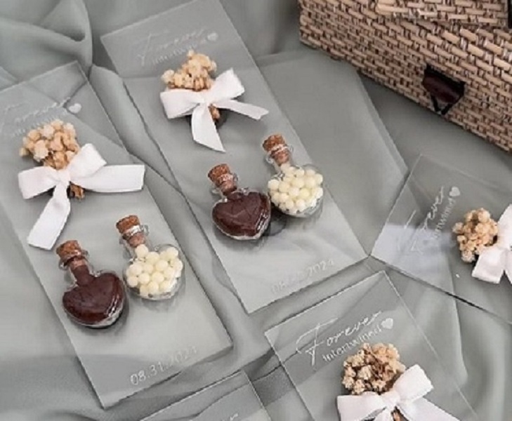 Borcanele elegante din sticlă, umplute cu cafea turcească aromată și delicate bucățele de ciocolată, reprezintă alegerea perfectă pentru a marca orice eveniment cu stil. Fiecare detaliu este atent gândit – de la panglica albă sofisticată până la accentele florale care adaugă un plus de eleganță și farmec.