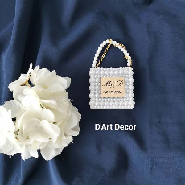 Geantă cu perle, etichetă exclusivă, nume și dată personalizate.