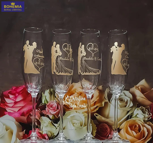 Pahare din cristal personalizate cu reflexii aurii, siluete.