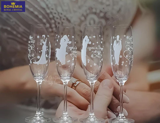 Paharele de șampanie gravate sunt întotdeauna un mare succes cu petrecerea miresei și cu invitații la nuntă, deoarece pot fi folosite în ziua nunții pentru a face toasturile de nuntă și vor fi folosite și în anii următori.