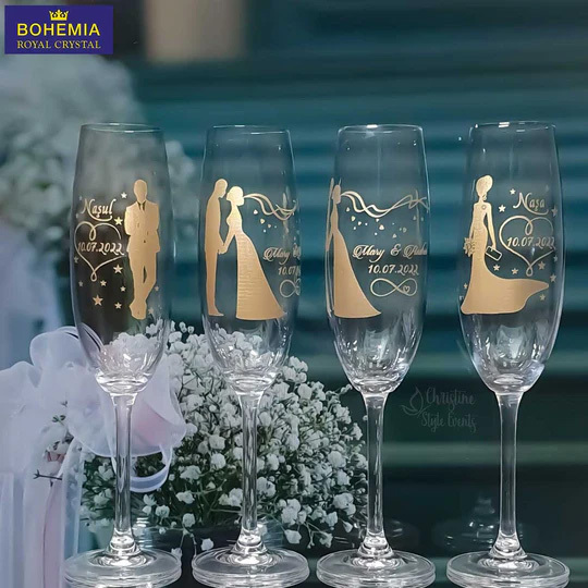 Pahare din cristal personalizate prin gravură şi apoi realizate în nuanță antique gold (tente aurii). Tip produs : Pahar pentru șampanie Marca : Bohemia Royal Crystal Material : Cristal Volum : 230 ml Înălțime : 257 mm Înălțime cupă : 142 mm