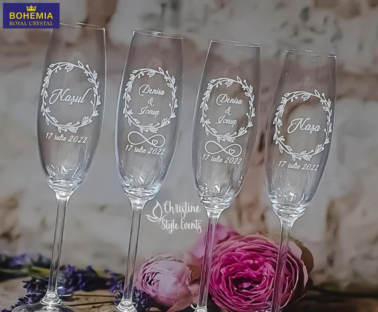 Paharele de șampanie gravate sunt întotdeauna un mare succes cu petrecerea miresei și cu invitații la nuntă, deoarece pot fi folosite în ziua nunții pentru a face toasturile de nuntă și vor fi folosite și în anii următori.Ce mod mai bun de a sărbători o nuntă decât să bem pentru o viață fericită alături de cei dragi.