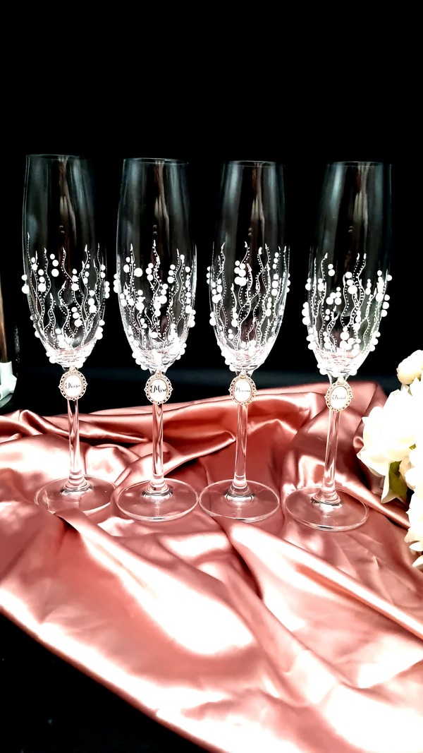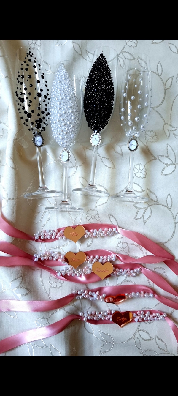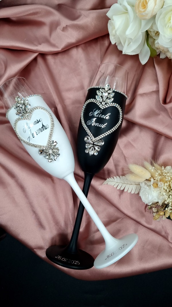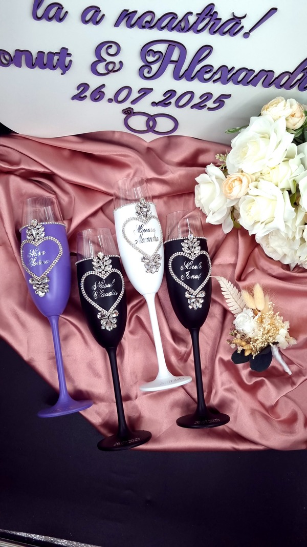 Fiecare pahar este realizat cu migală, folosind perle delicate și cristale strălucitoare, pentru un design sofisticat și rafinat. Personalizate în funcție de tematica nunții, aceste pahare adaugă un plus de eleganță și unicitate evenimentului tău.
