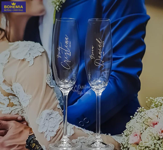 Pahare din cristal personalizate prin gravură şi apoi realizate în nuanță antique gold (tente aurii).